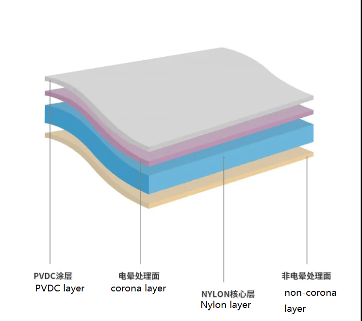 Boiled PVDC coated biaxially oriented nylon film on one side. With BOPA as the base material, PVDC is coated on the corona side, and the other side is the non-corona side.